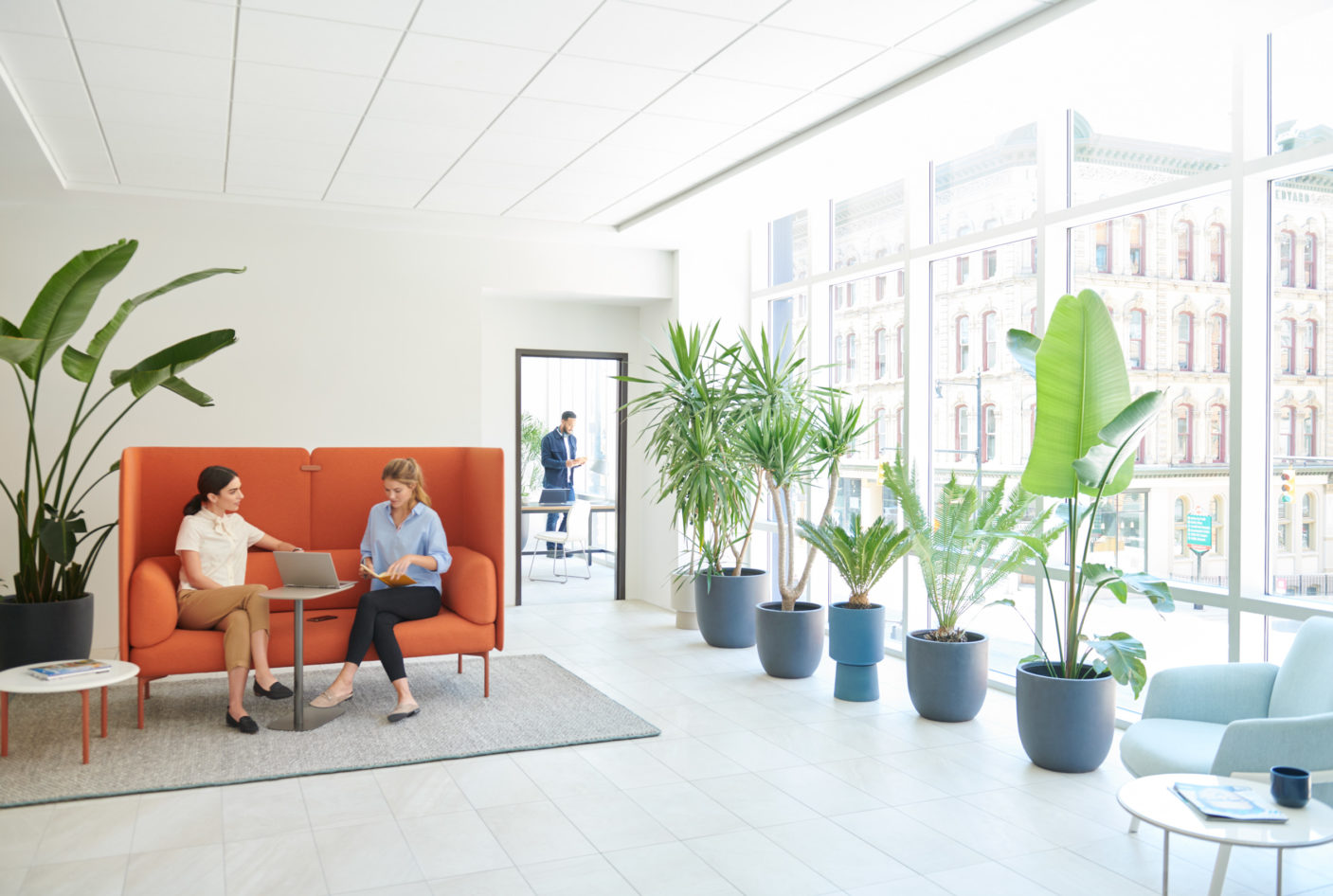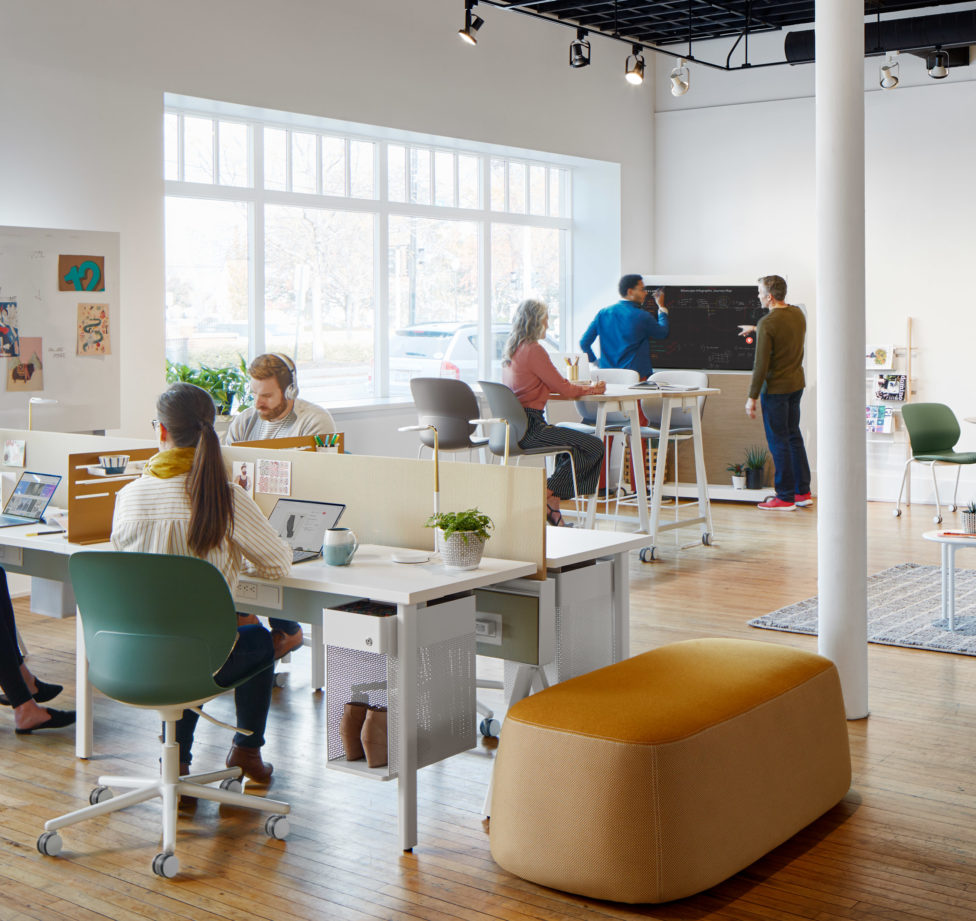 Table, floor, and pendant lighting used in combination with natural light from windows and skylights creates a comforting space, enriches any atmosphere, and generates a distinct vibe that makes a workplace unique. Whether you are looking to support individual tasks or group interactions, lighting has the potential to enhance individual well-being and the overall experience of any workforce.