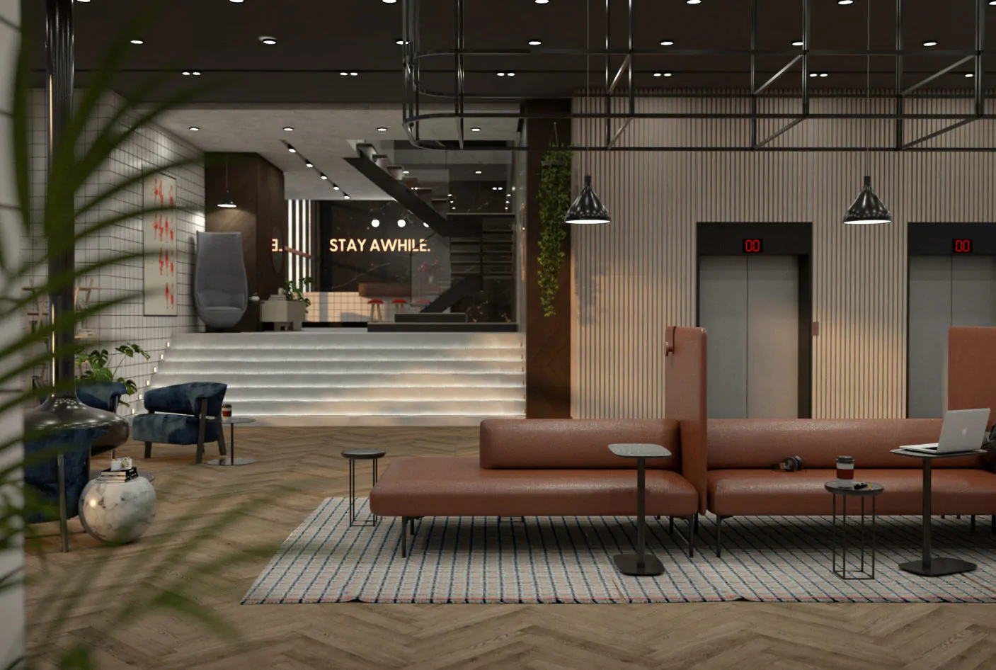 The main entrance sets the stage with a vibe that delivers the first impression. It should be designed to not only reflect company’s brand, but also inspire the customers with versatile, thoughtful solutions—this is where workplace hospitality begins. This entry point is a combination of spaces that welcome guests, enable socializing and dining, and support collaborative work.