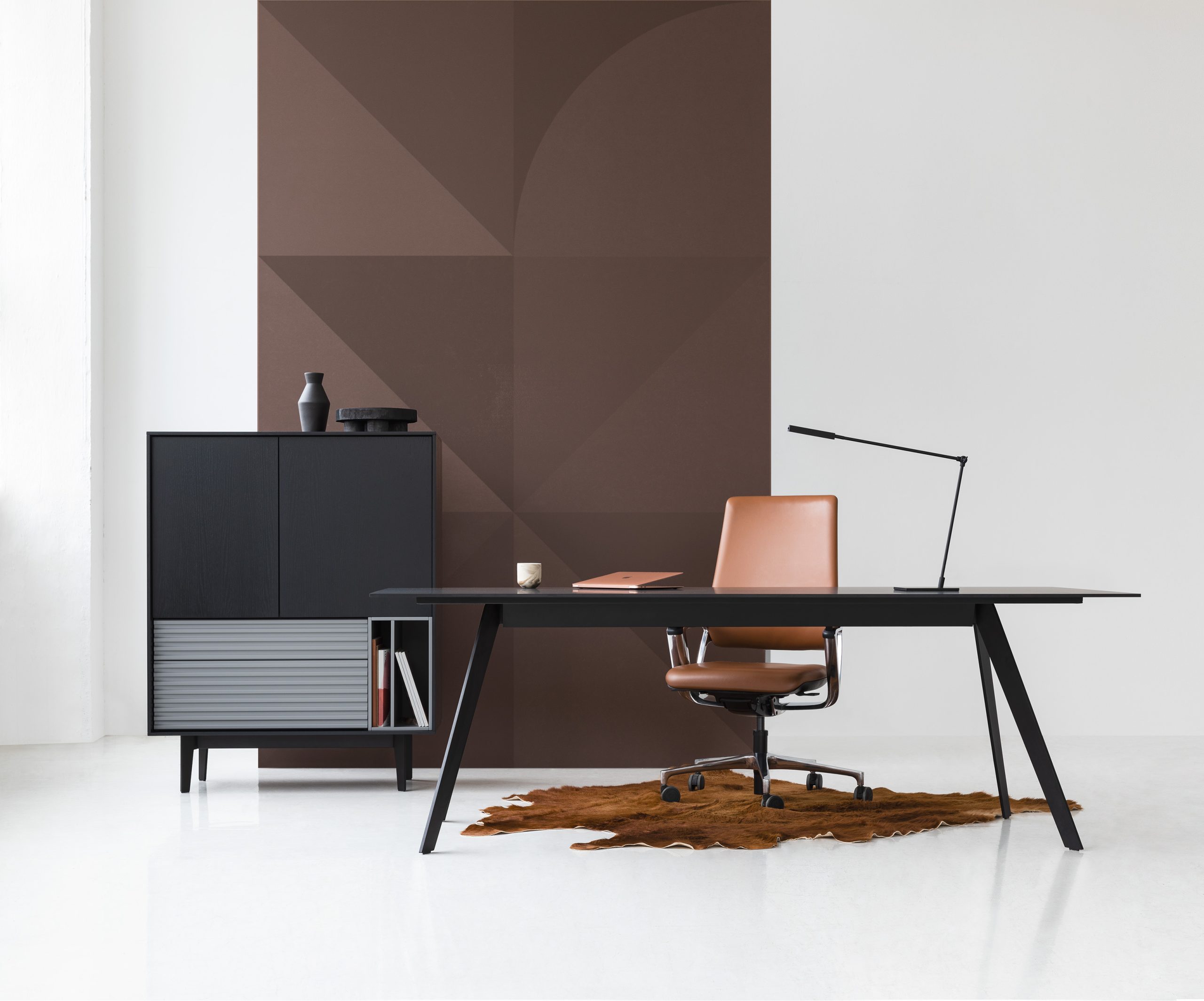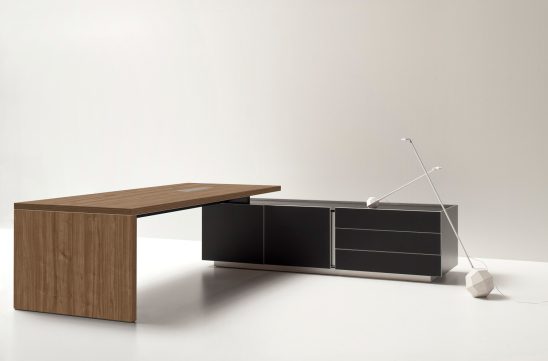 Dignis desk, freestanding or supported on a cabinet is delicate in form and eye-catching. A wide choice of finishes and colors available for desktops gives an individual character while meeting the most important requirements of durability and comfort of use. Dignis desk is dedicated to offices but also work in any unconventional office interior.