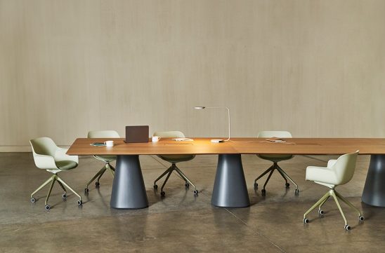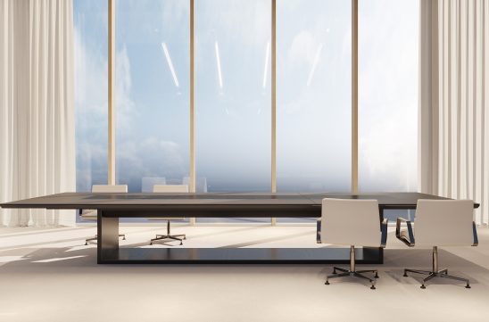Gravos meeting table was designed to emphasize both the functionality and prestige of a space, standing out through their monumental presence and striking form. Seemingly classical yet modern, it captivates with refined finishing details. Gravos meeting table combines elegance and aesthetic appeal through a variety of color variants, while maintaining a high level of functionality thanks to its generous dimensions. Additionally, it offers the option of adding extended tabletops, seamlessly connected at the corners with miter joints, further enhanced by the thoughtful design details of its base.