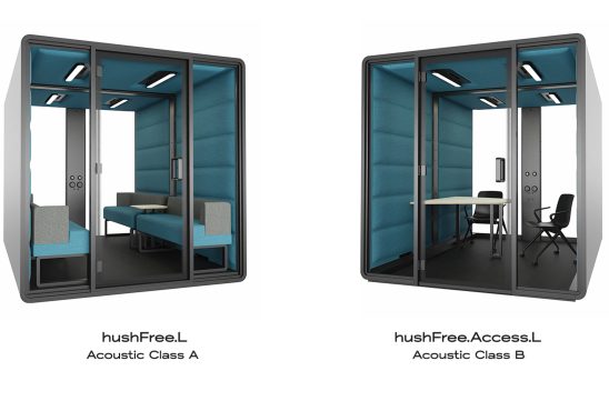 Both hushFree.S and hushFree.XS offer a sound reduction of 30.2dB and 30.3 dB and are certified Class A according to ISO 23351-1:2020 for office acoustic booths. Advanced acoustic panels isolate the user from external noise, ensuring focus, clarity, and privacy, essential for both quick calls and longer remote meetings.