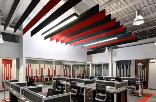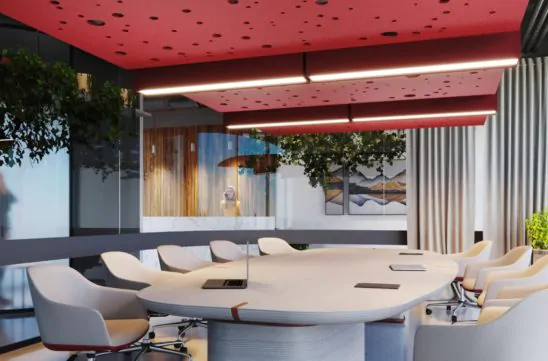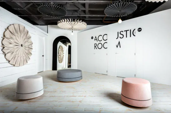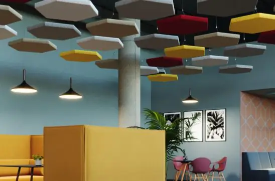 Sky Ceiling is a modular system of tiles that sets out to change this with a design language that imbues a room with visual energy while improving its soundscape. Sky ceiling´s solution allows an easy attachment with magnets directly to a ceiling’s metal construction, which makes possible to experiment with different arrangements and change things around. The soundabsorbing properties of fabrics diminish the sound waves of med and high tones. Available in a wide variety of colours. Can be combined with Sky wall.