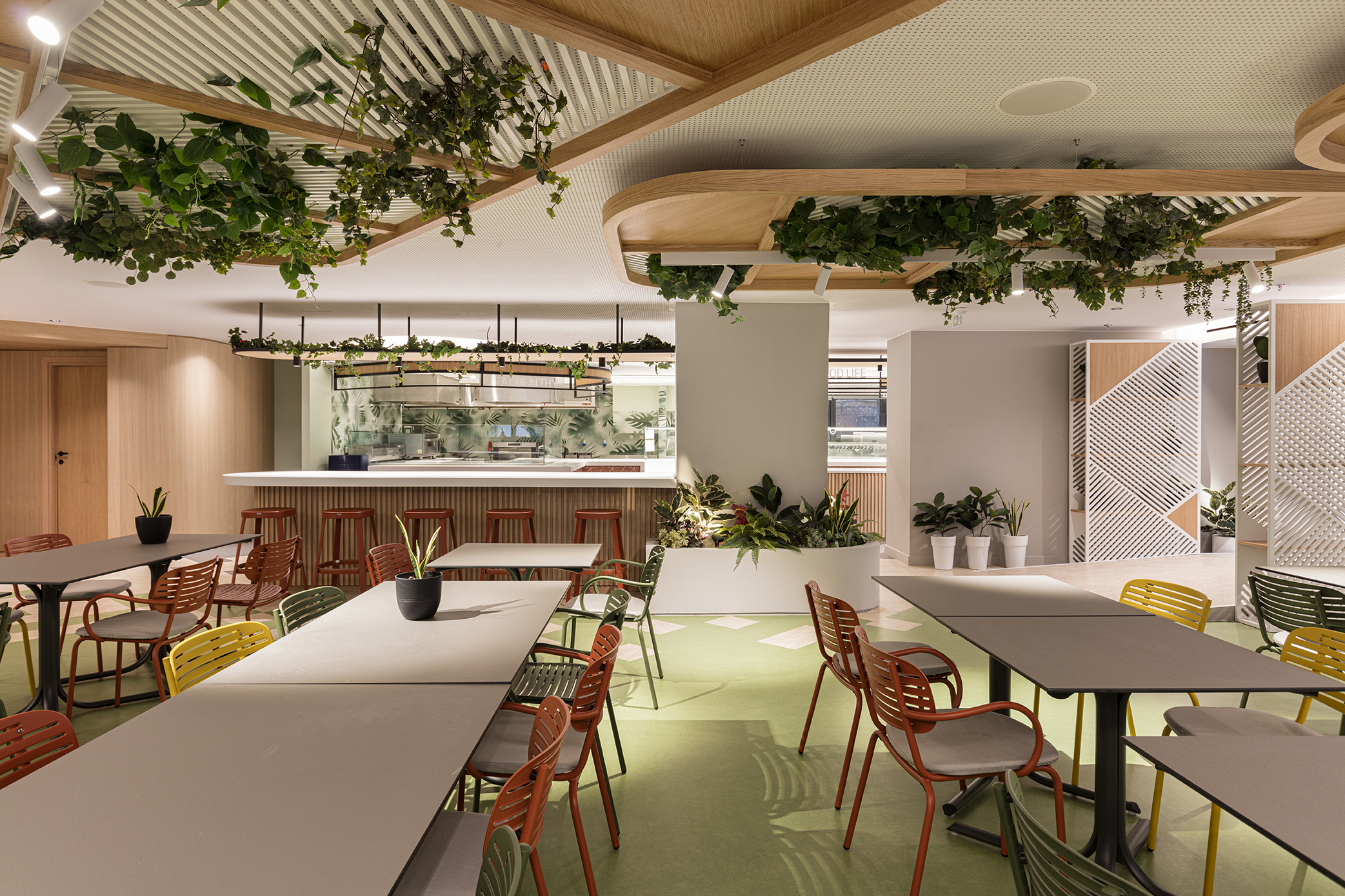A modern space that integrates sustainable and human-centered design. The project features lounge furniture, booths, sound-absorbing panels, and wall coverings, all contributing to its innovative character and distinct identity.
