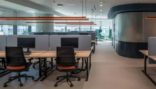 Οργανωμένος κυρίως σε διάταξη ανοικτού τύπου, ο εργασιακός χώρος προάγει την ευελιξία και ενισχύει την τη συνεργασία και την ομαδικότητα. Μέσα από τη μεγάλη ποικιλία επιλεγμένων επίπλων γραφείου, καθισμάτων, διαχωριστικών και ηχοαπορροφητικών, αναδεικνύονται διαφορετικοί χώροι, κάποιοι ιδανικοί για εστιασμένη εργασία και ιδιωτικότητα και άλλοι κατάλληλοι για επικοινωνία και κοινωνικοποίηση.